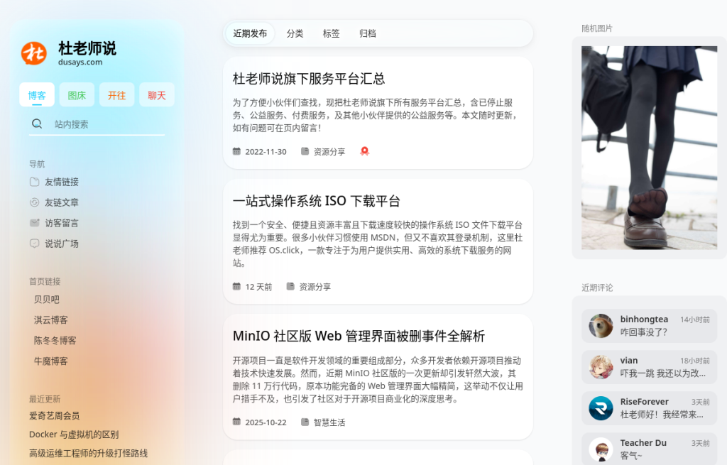 这里是我在网络上认识的优秀小伙伴们,他们的博客各有特色,欢迎访问交流xaoxuuFor all time, always.枋柚梓繁星永存,记忆亘古不变。杜老师说https://dusays.com 友链页面建设中… 友链格式本站信息申请须知 title: 网站名称 url: 访问链接 avatar: 头像地址 screenshot: 封面图片 description: 网站描述 1234站名:SunnyX描述:人生苦短,即使行乐头像地址:https://zyoushuo.cn/img/SunnyX.png访问地址:https://zyoushuo.cn 您的小站内容肯定是健康的、合法的且无不良信息 您的小站肯定已添加了本站的友链信息 您的小站肯定可以正常访问,服务器稳定且保持了一定的活跃度 您的小站界面是肯定干净、清爽且不包含任何广告
